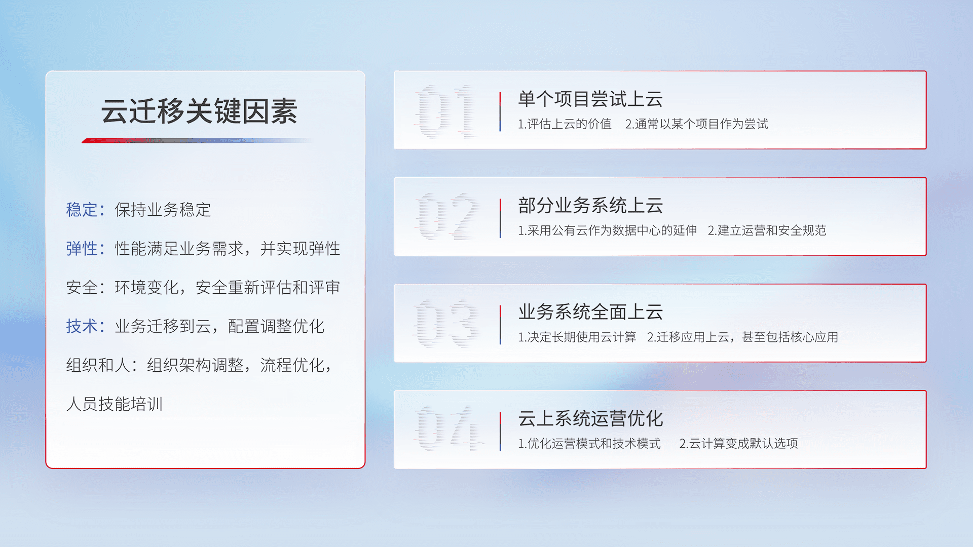 结合实际业务,,从规划设计、、、云平台选型、、、云原生改造、、、数据迁移、、、、集成交付,,迁移全过程为客户识别最佳上云路径,,,做好风险识别管理,,,,设计网络架构、、、身份权限、、、、安全审计合规、、、操作审计、、日志审计、、、监控告警策略、、多站点容灾设计等,,,,对云上基础设施进行整体规划,,,,提升IT治理水平,,,,以满足弹性、、高可用、、、高性能的需求。。。